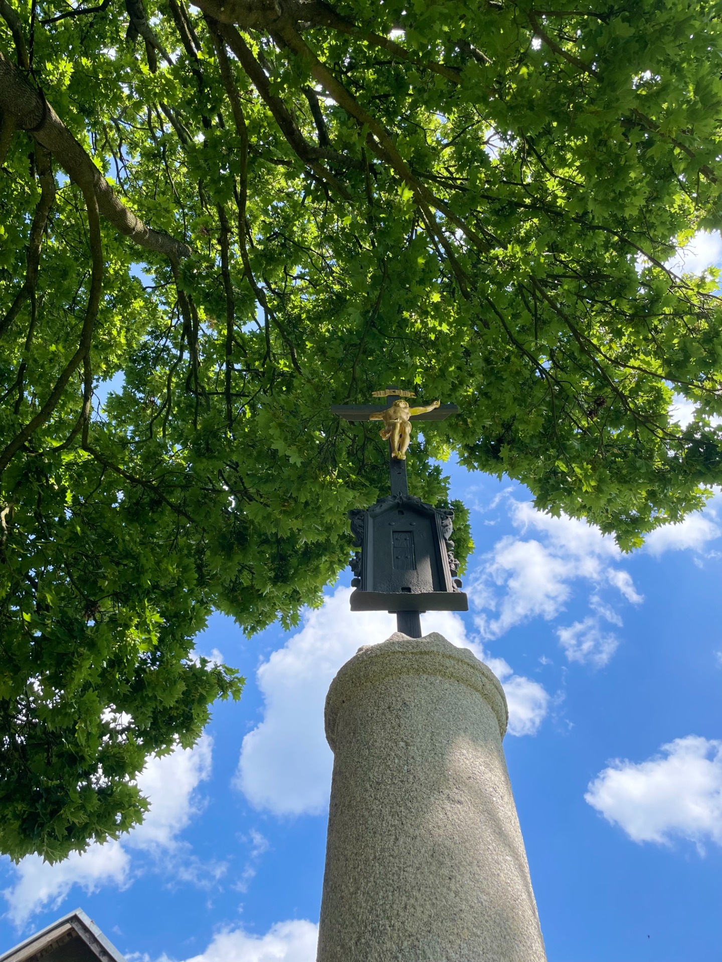 Dokončení obnovy "spadlého" centrálního kříže v prostranství bývalého hřbitova za kostelem sv. Michaela Archanděla v Horním Dvořišti - osazení zrenovovaného litinového kříže